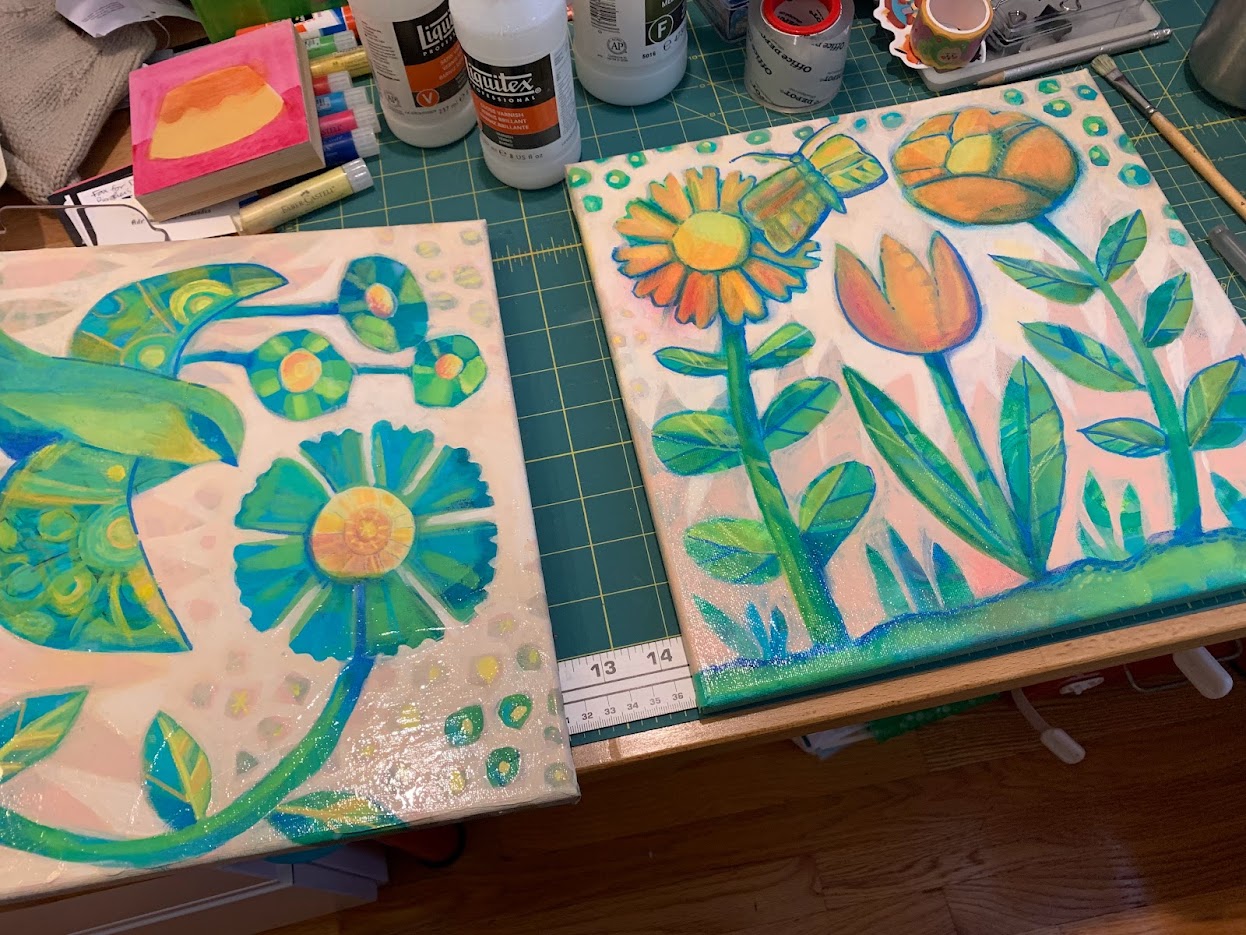The third of three paintings in a series called "Meadow Birds". Painting 3 of 3 features one blue bird and one flower on a layered background. Painted in high quality acrylics and mixed media on stretched canvas.
