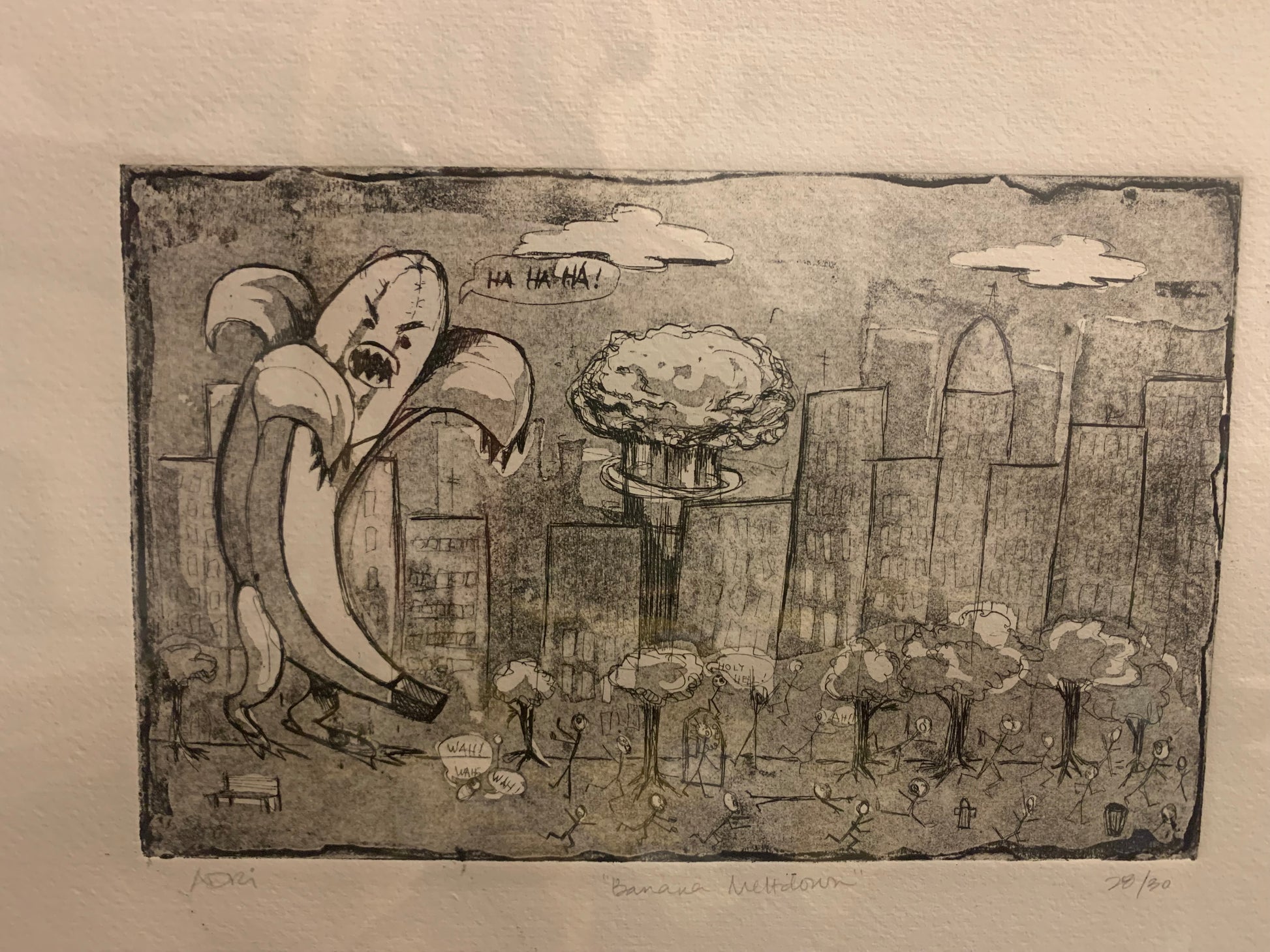 A radioactive giant banana preys upon the unsuspecting city. Banana rampages and yells HAHAHA in this black and white illustration done in etching. The artwork was etched onto a copper plate and printed on archival paper (Fabriano Uno) in an edition of 30.