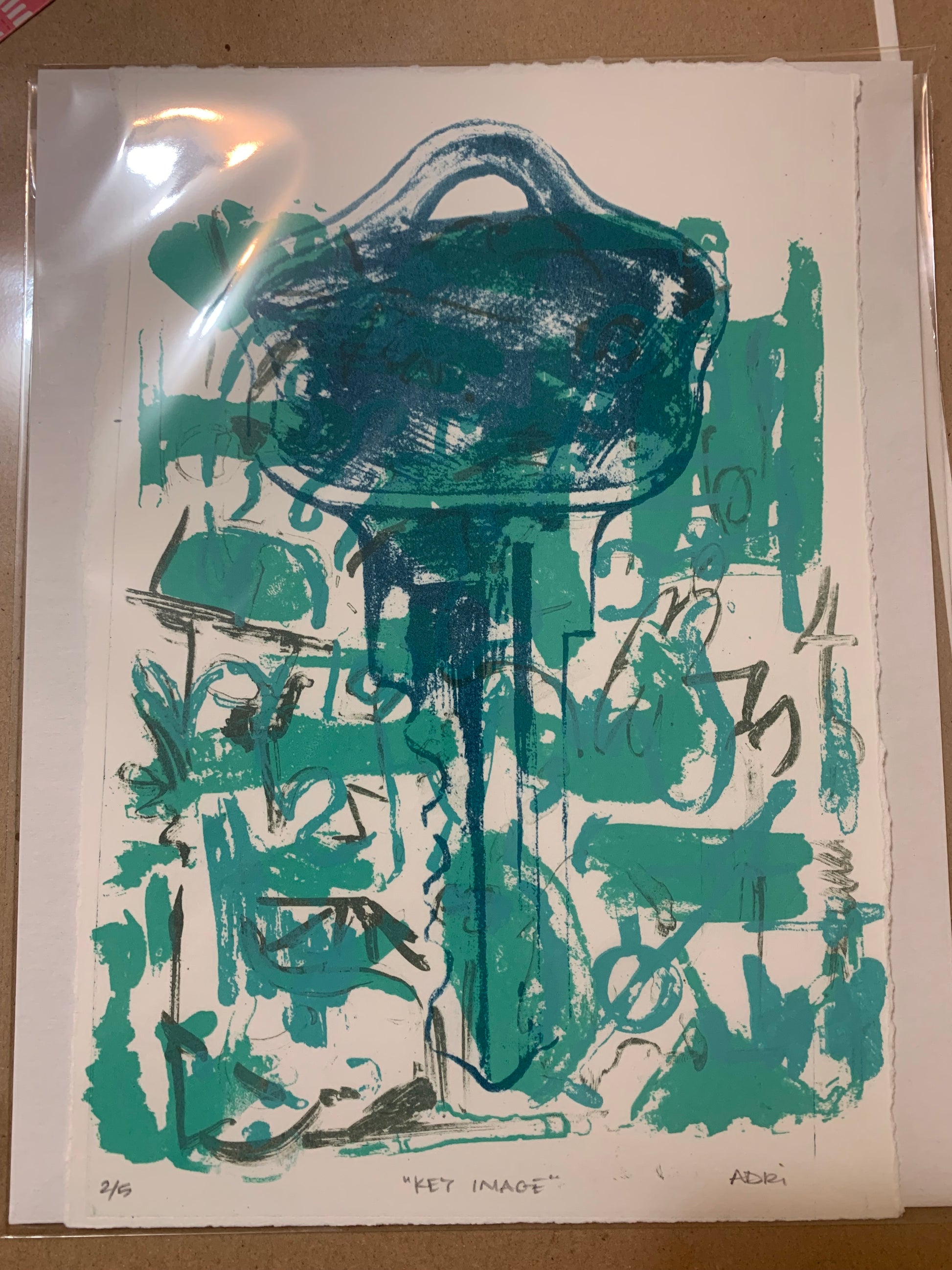 Image is a house key in blue lithograph with textures and color overlaid and under in teal and light blue silkscreen.