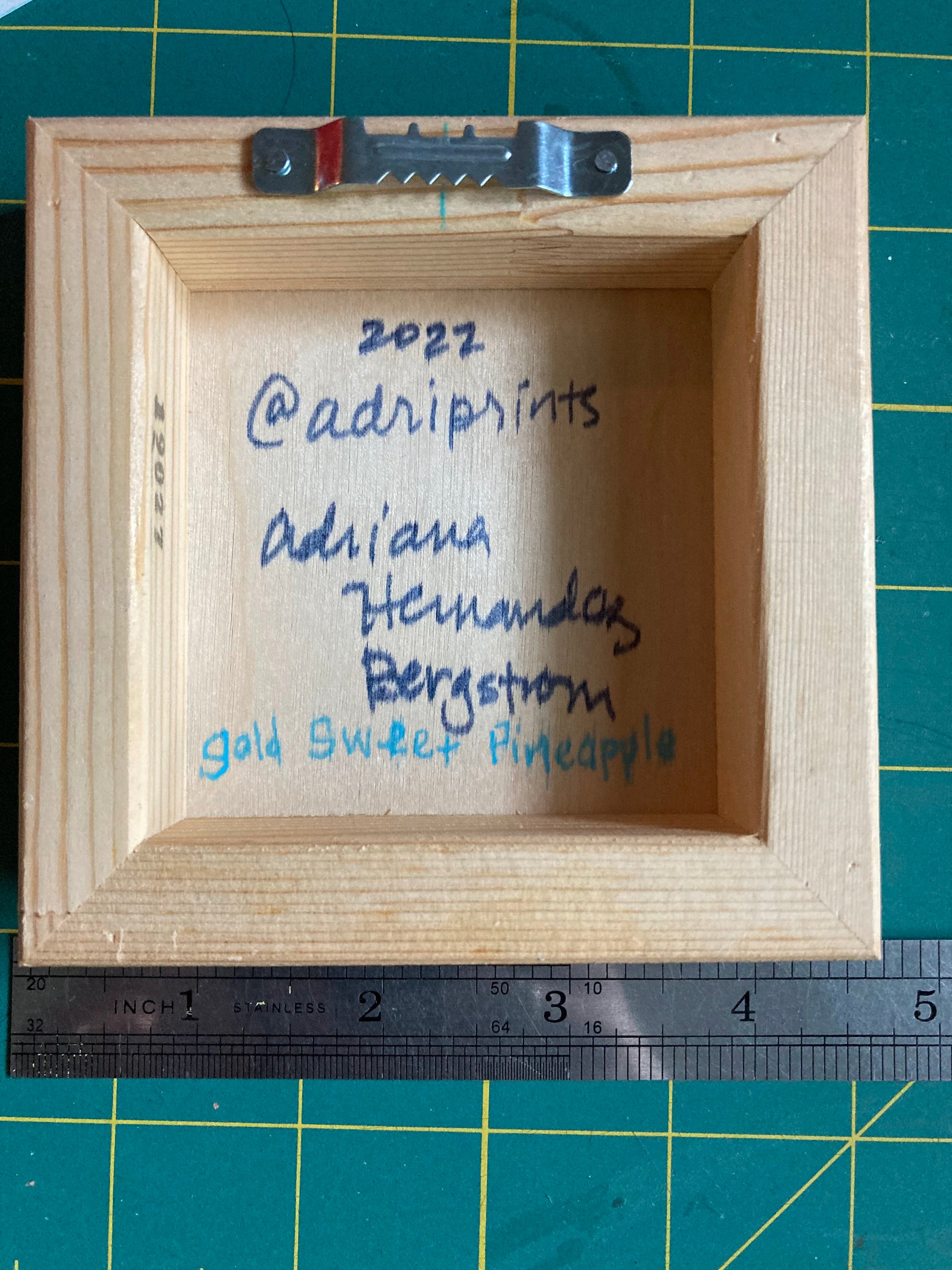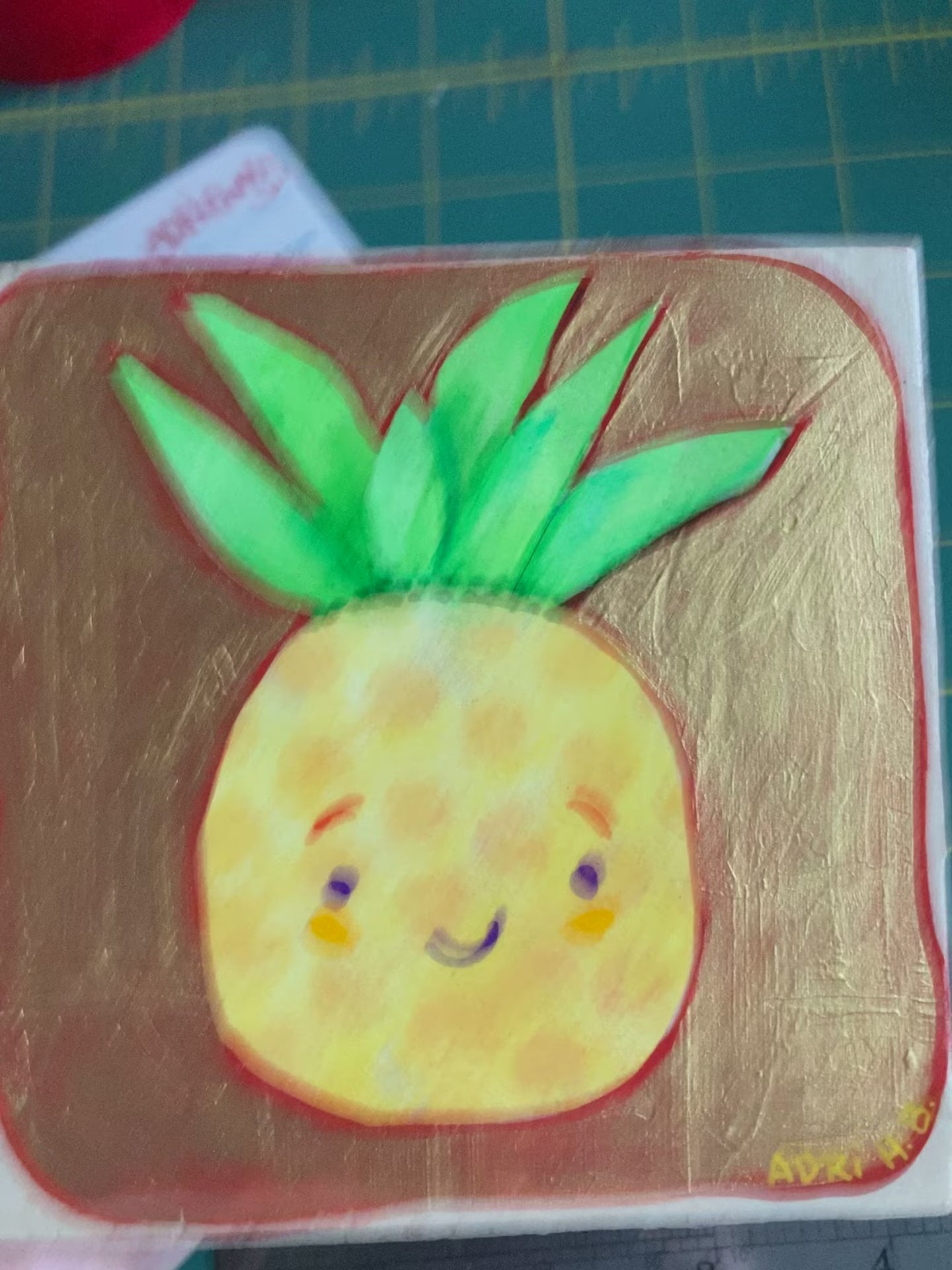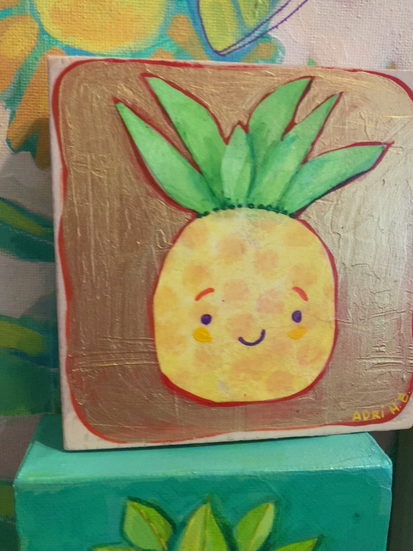 Original painting of a little smiling pineapple in acrylics and mixed media on wood. Shiny gold background. Signed on the back.