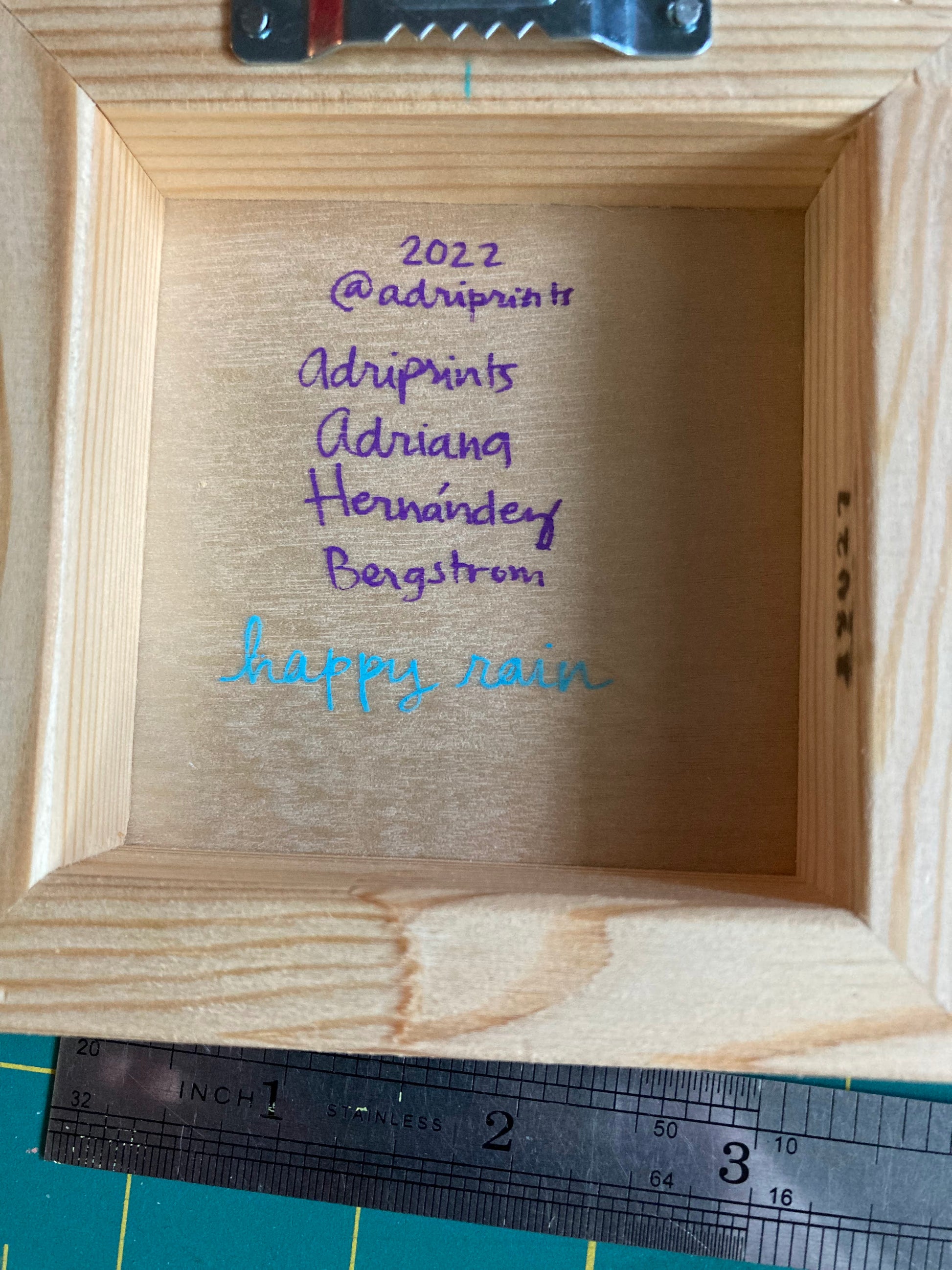 Original miniature painting in acrylics and mixed media on wood. Smiling blue rain cloud on visible cradled wood background with raindrops and lightning.
