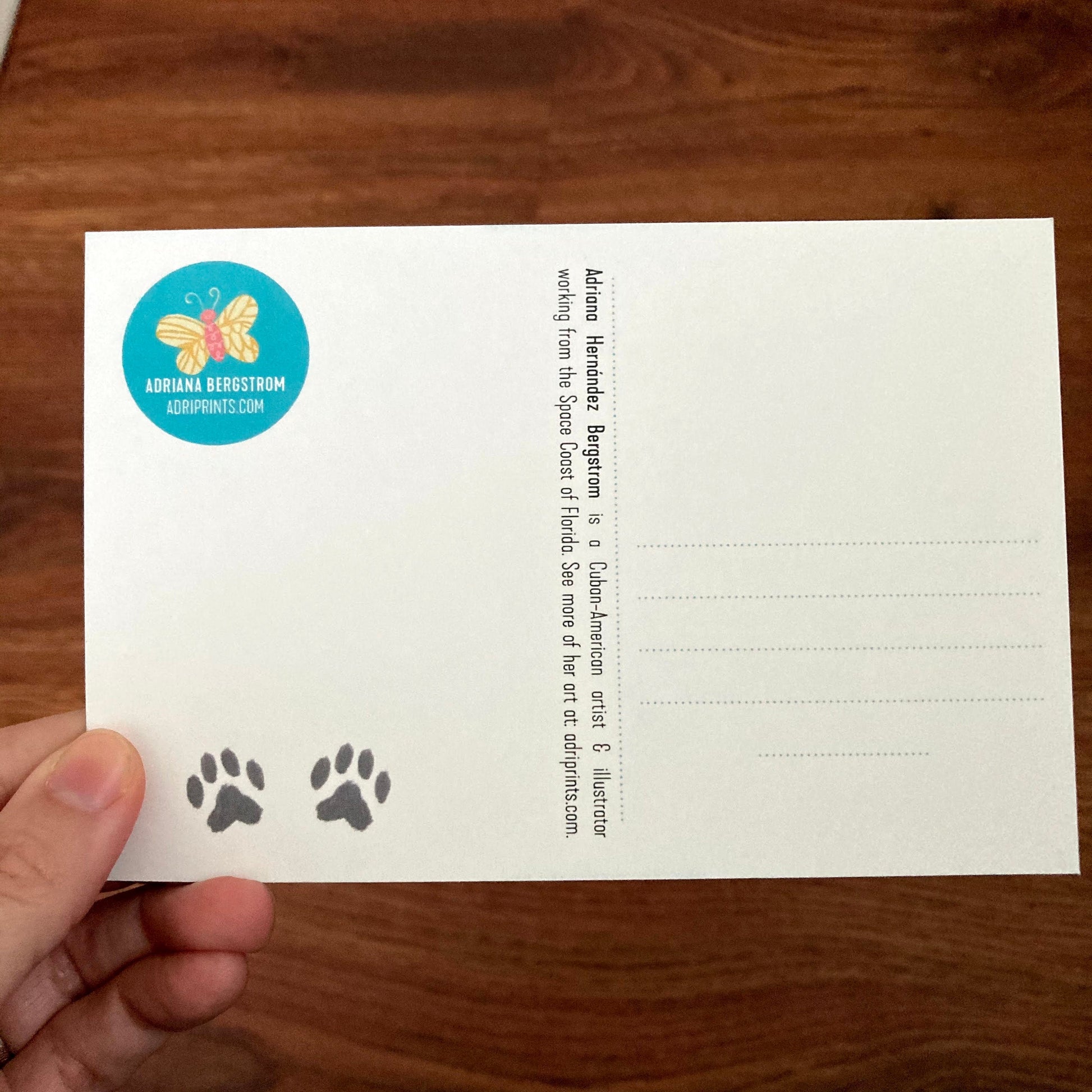 Back of the postcard is blank except for paw prints, artist’s logo and short bio (see pic).