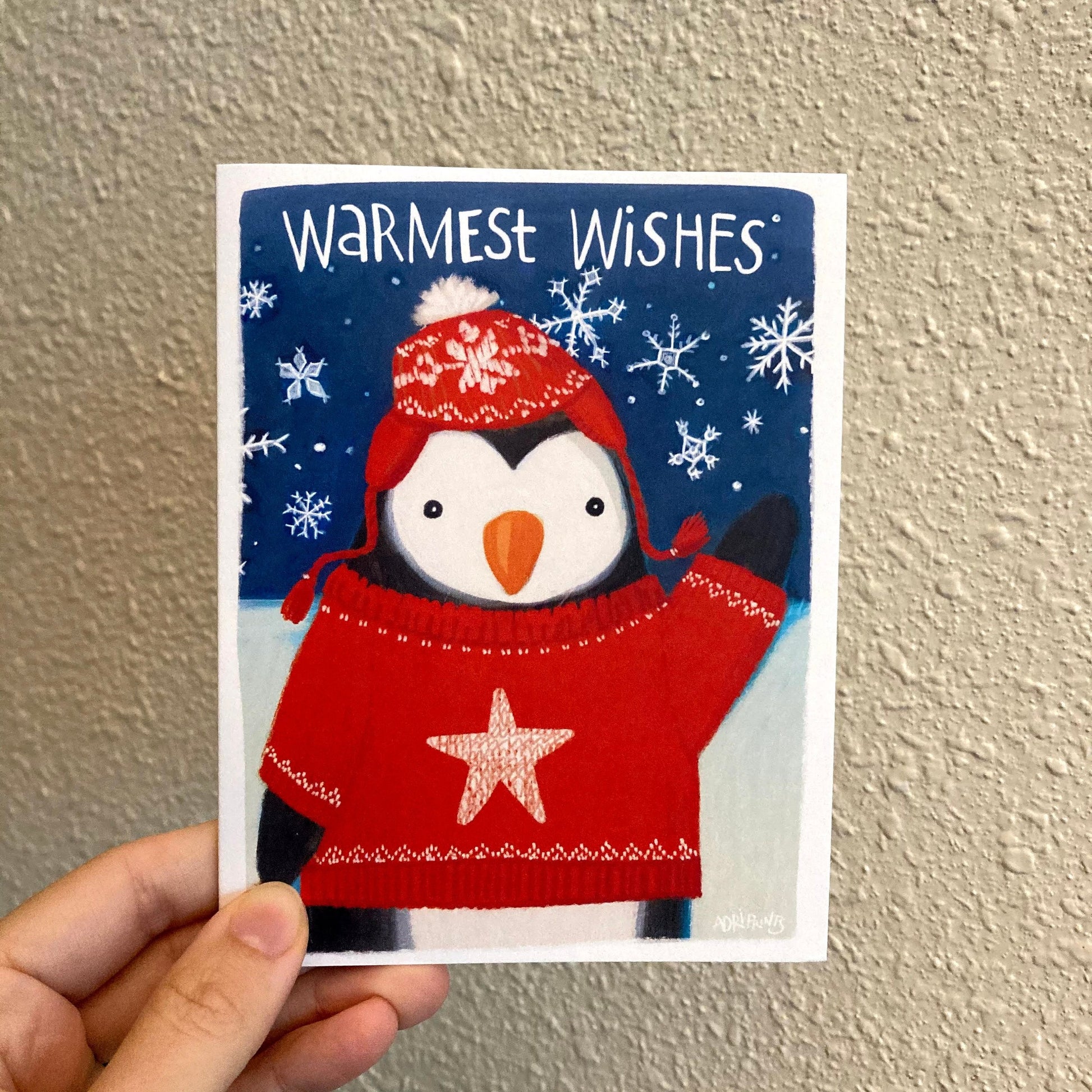 Send your warmest holiday wishes with this super cute kawaii painterly penguin boxed card set. Heartfelt sweet penguin wearing knitted pompom chullo hat and star sweater. Send your love with these cuties! These are printed on premium matte paper, printed, folded, packed by the artist.
