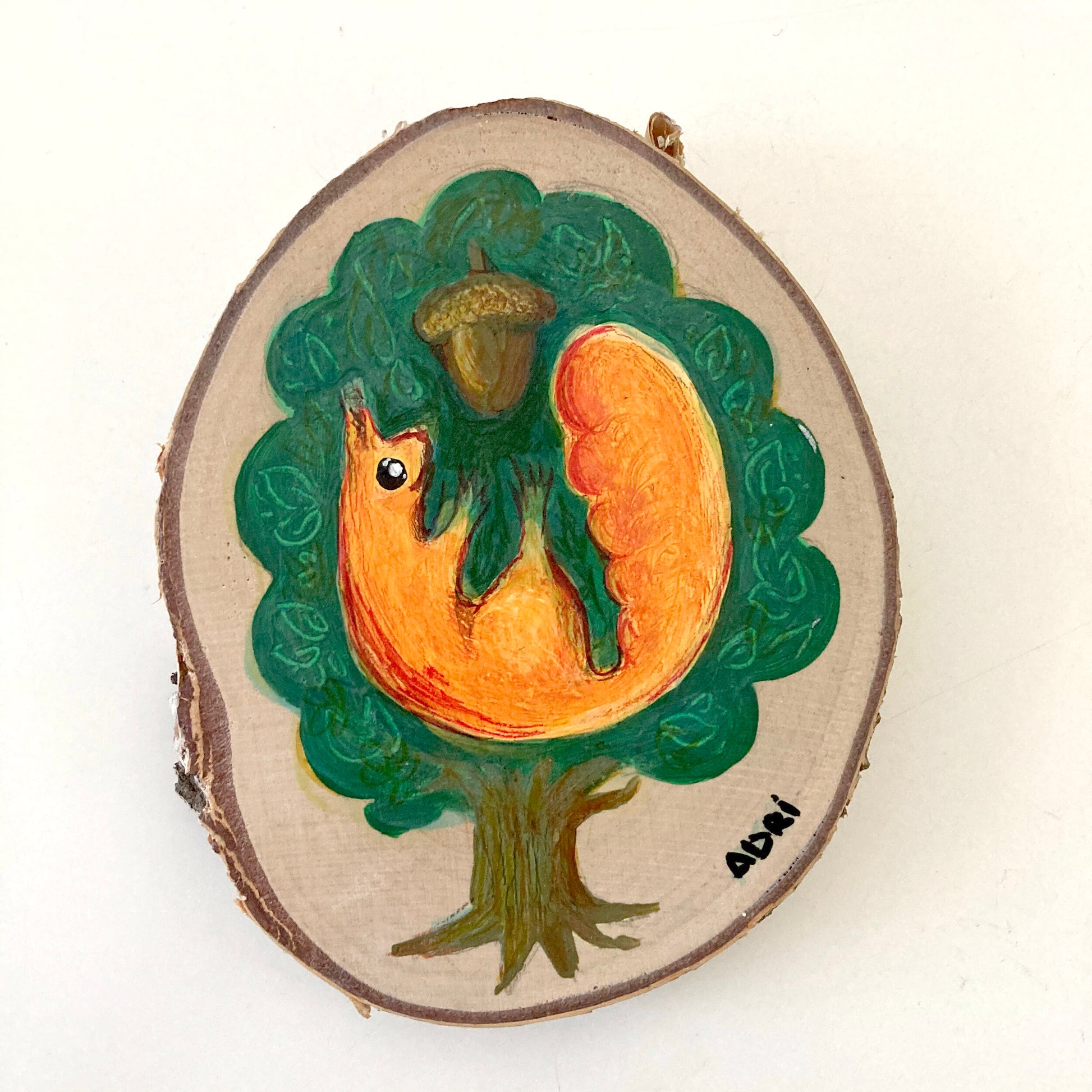 Every squirrel dreams of that special day when the find the nut of their dreams. Squirrel on Wood is literally a painted squirrel in tree painted on on a birch disc. Hardware for hanging already installed. Wood measures approximately 4.5 x 5” at it’s widest and longest.