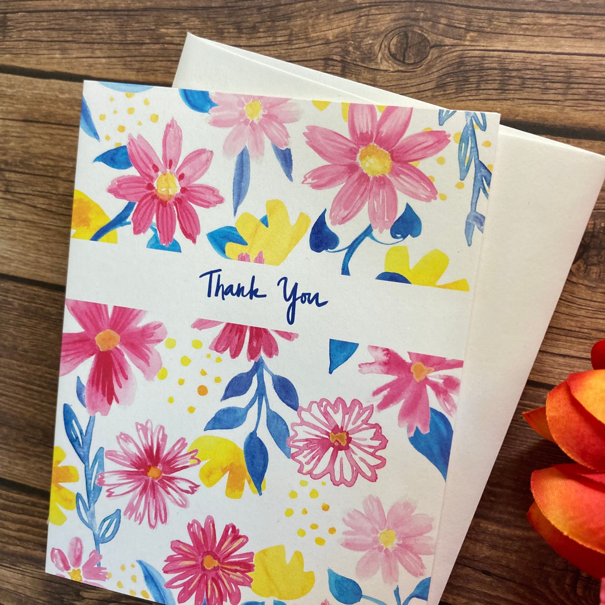 Send your appreciation with this handlettered Thank you! in fresh sweet yellow, pink and blue florals.